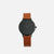 This is our black on brown leather - a more modern color combo. The stainless steel case has a brushed matt black finish with a subtle reflective dial. The hands and numbers are in a shiny gun metal finish.